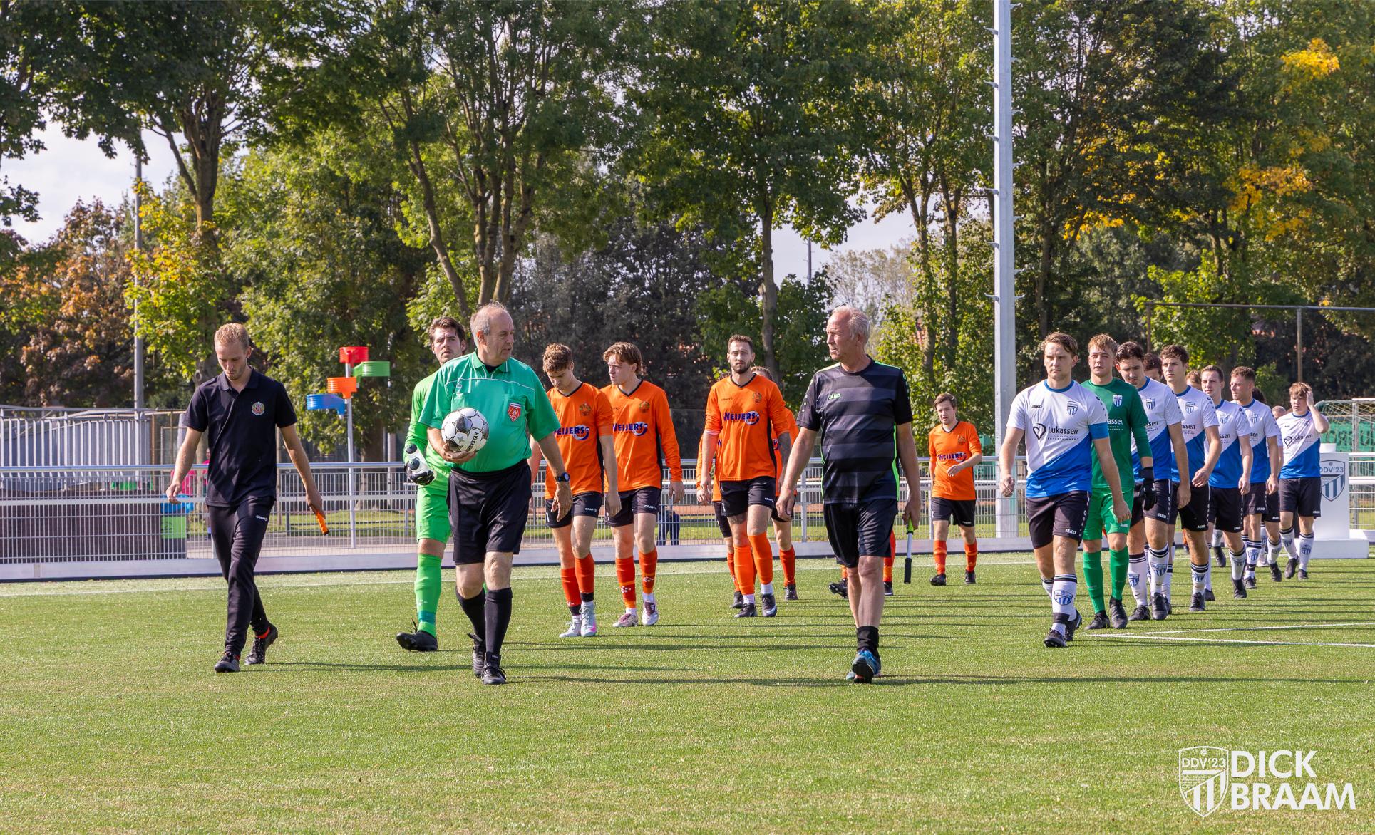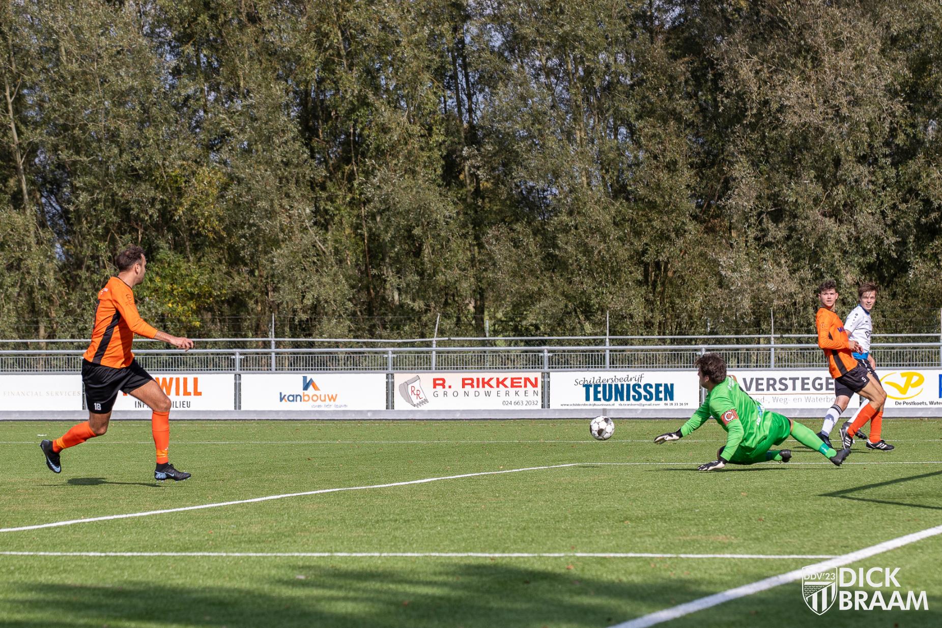 Na een stroeve openingsfase namen de manschappen van trainer Martin de Winkel het heft in handen om het vervolgens ook niet meer kwijt te raken. DDV’23 had grotendeels controle over het duel en kwam dan ook als terechte winnaar uit de bus. Gelet op het aantal kansen is de 3-1 overwinning wellicht een wat magere afspiegeling van de daadwerkelijke krachtsverschillen op deze fraaie zondagmiddag.