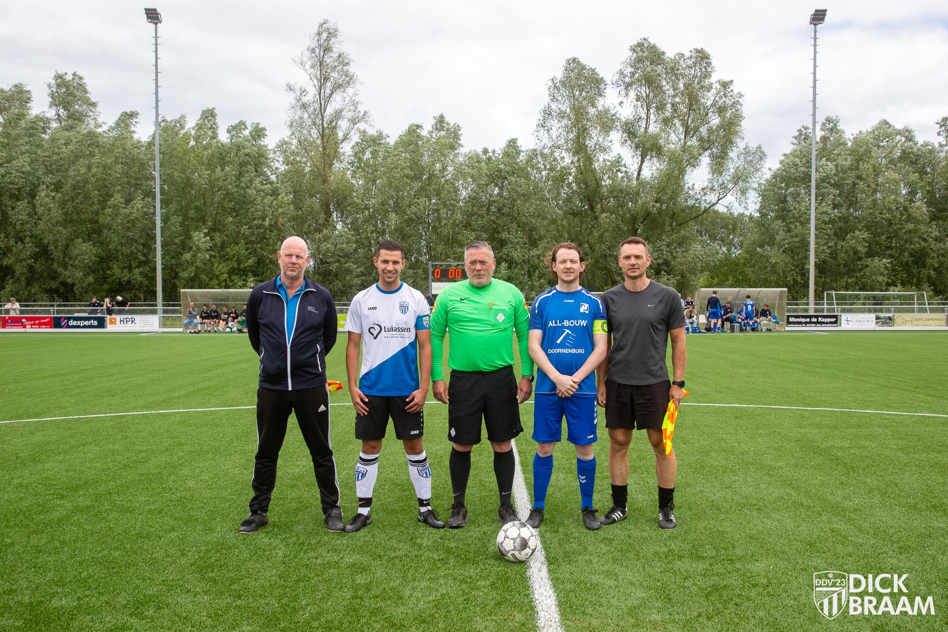 Nadat scheidsrechter Norris beide ploegen in beweging had gezet, trok GVA voorzichtig het initiatief naar zich toe. De eerste kans was dan ook voor de Doornenburgers maar de GVA-aanvaller kreeg in de 8e minuut het leren kleingoed vanaf een meter of 7 niet tussen de palen. DDV’23 reageerde in de tegenstoot maar zag vanuit kansrijke positie een schot geblokt worden. 2 minuten later was het wel raak voor de polderformatie toen Kai Mulder het meest attent reageerde op een bal die min of meer in niemandsland belandde. Met de kop wist hij bekeken de bal over de uitkomende GVA-goalie heen te koppen (1-0). Een wat goedkoop gekregen voorsprong maar daar maalde de polderaanhang natuurlijk niet om. Heel lang heeft het thuispubliek niet kunnen genieten van de voorsprong want amper 2 minuten later had de formatie van trainer Roy van der Hoek de gelijkmaker alweer binnen geprikt. GVA wist optimaal te profiteren van een inschattingsfout in de DDV-defensie en Leroy had geen antwoord op het gekruiste schot van een meter of 10 (1-1). GVA bleef voor rust de betere ploeg en op het half uur had het weinig geluk toen een inzet via de buitenkant van de paal weer het veld insprong. DDV’23 probeerde weliswaar tot aanvallen te komen maar zag veel pogingen rondom de 16 stranden. De Doornenburgers regen de kansen ook niet aaneen maar toonde wel het meeste initiatief. Toen scheidsrechter Horris de teams voor de rust naar binnen floot mocht DDV’23 zich wellicht het meest gelukkige prijzen met de 1-1 ruststand.